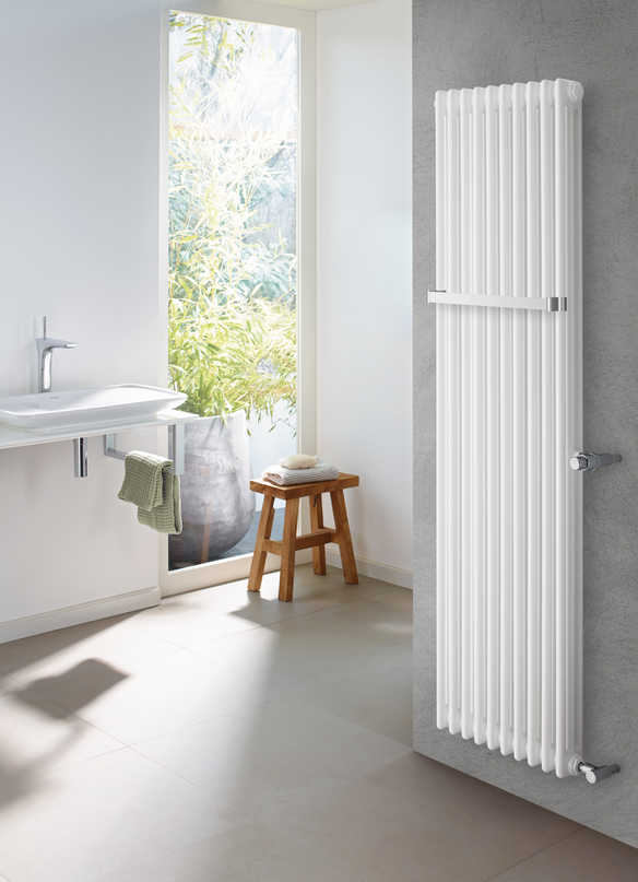 Der seitliche Anschluss mit Thermostat-Position in angenehmer Griffhöhe passt auf viele verschiedene Badheizkörpermodelle und auch Heizkörper nach Mass (z.B. Zehnder Charleston 2- bis 6-Säuler ab einer Bauhöhe von 1200 mm).