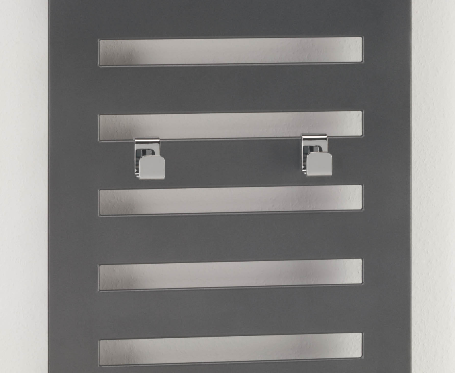 Für Zehnder Fina Lean Bar. Hochwertige Ausführung aus Stahl, verchromt oder in Farbe, mit verdeckter Befestigung an 2 Punkten hinter dem Heizkörper; belastbar bis max. 10 kg.