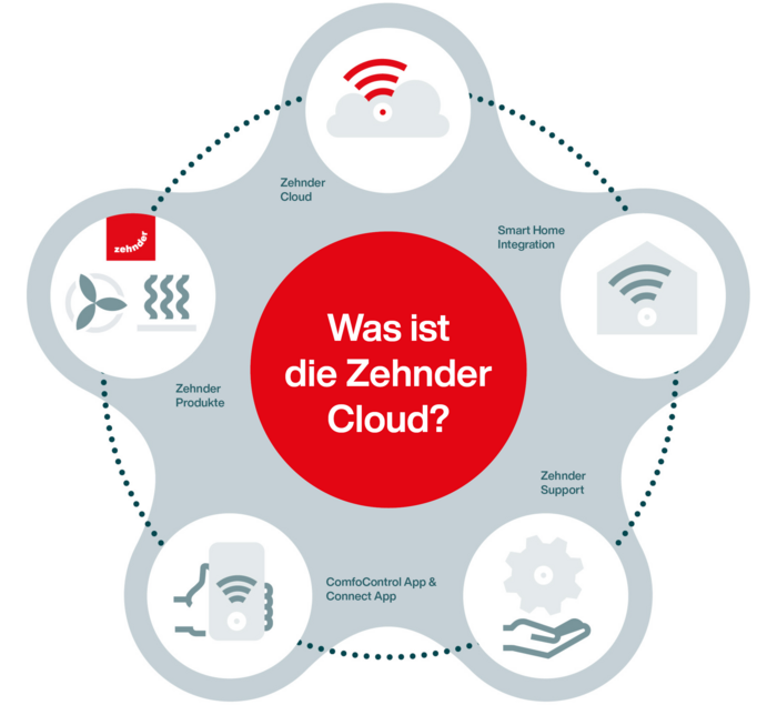 Die Zehnder Cloud ermöglicht eine vereinfachte Bedienung mit modernsten Steuerungsoptionen. Ausserdem kann die Software Ihres Lüftungsgeräts laufend aktualisiert und mit neuen Funktionen angereichert werden. So können Ihre Produkte miteinander interagieren, um Energie zu sparen und die Leistung in allen Systemen zu verbessern.