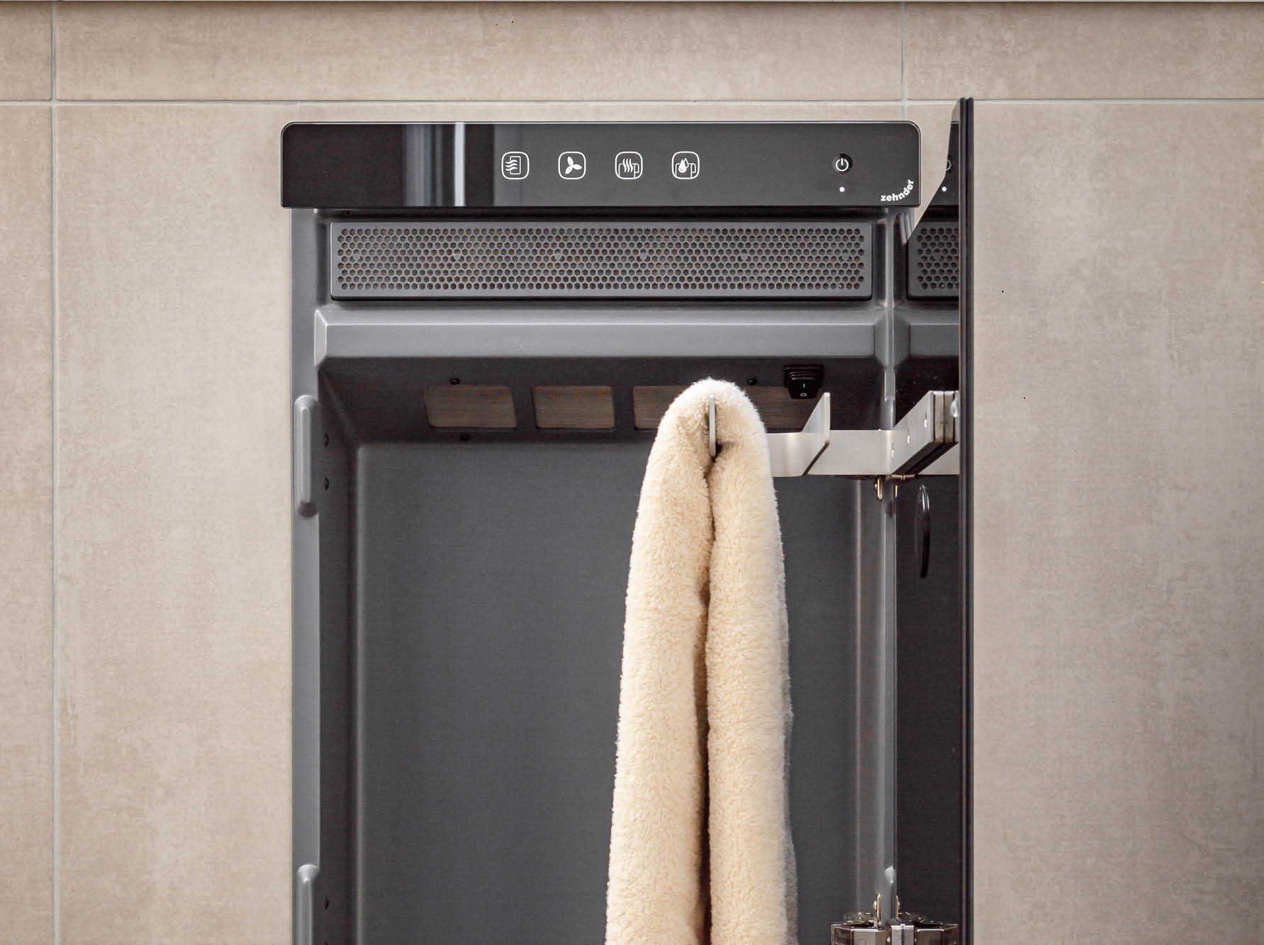 Durch den integrierten Heizlüfter erlaubt Zehnder Zenia unabhängig von der Zentralheizung flexible, rasche Wärme auf den Punkt und die Strahlungswärme der eleganten Infrarot-Glasheizfläche sorgt dabei für ein wohliges Raumklima. Hinter der edlen Glasoberfläche können Textilien hygienisch getrocknet werden, wobei die Schnelltrocknungs-Funktion aufgrund stark verkürzter Trocknungszeiten die Keimbelastung auf feuchten Badtextilien deutlich verringert. «Besonders meine Frau liebt Zehnder Zenia heiss und innig. Sie nutzt das Wärmekomfortgerät zum Wärmen ihrer Badetücher vor und nach dem Duschen. Sogar unsere extra flauschigen und voluminösen Badetücher lassen sich wunderbar unterbringen» erzählt Thomas Habegger.