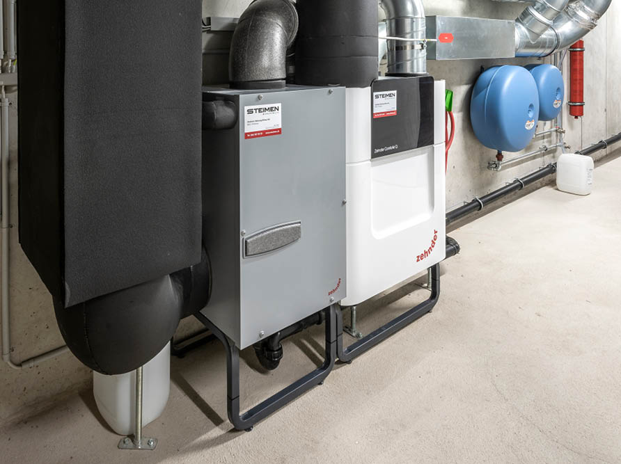 Das Lüftungsgerät, Zehnder ComfoAir Q befindet sich im Keller. Eine Steigleitung mit der Zu- und Abluft verbindet die Wohnungen mit dem Lüftungsgerät. Der Luftaustausch bei der Grundwohnungslüftung funktioniert wie bei einer Komfortlüftungsanlage inklusive Wärmerückgewinnung, was bei reinen Abluftsystemen nicht der Fall ist.