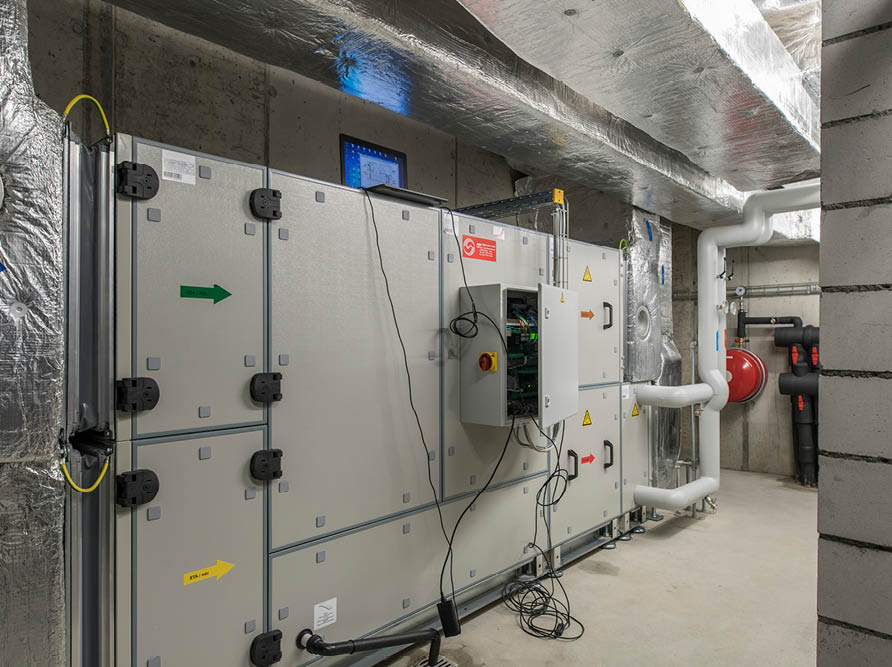 Das Neun-Parteien-Haus wird durch ein einzelnes Grosslüftungsgerät mit Frischluft versorgt. Dieses Zentralsystem bietet die idealen Voraussetzungen für alle Beteiligten in puncto Komfort, Energieeffizienz, Wohngesundheit und Werterhalt der Immobilie.