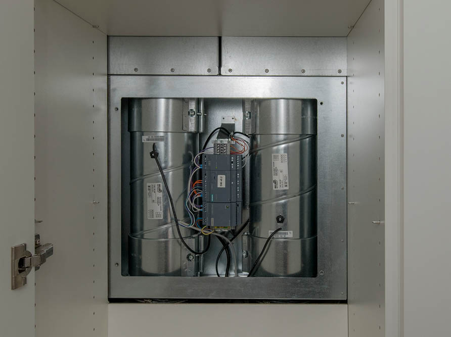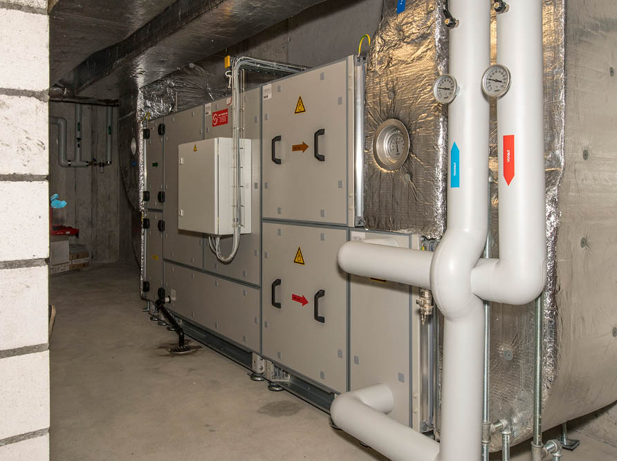 Das im Keller platzierte Grosslüftungsgerät kann durch seine Modulbauweise an das konkrete Bauobjekt angepasst werden. Es verfügt über eine Reihe intelligenter und innovativer Funktionen. Die Vortemperierung der Zuluft erfolgt über die Erdsonden-Wärmepumpe, mittels derer ein Nachheizregister betrieben wird. Die Wärmerückgewinnung aus der Abluft ist gegen 90 Prozent. Für besonders heisse Sommertage verfügt das Gerät standardmässig über einen Bypass.
