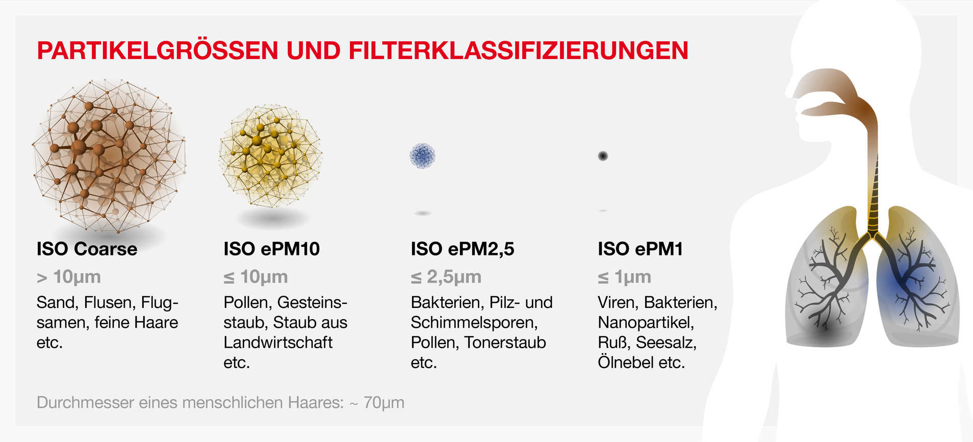 Seit Januar 2017 ergänzt die Luftfilternorm ISO 16890 zur Filterbewertung und -klassifizierung den bisherigen Standard EN 779 und gilt ab 1. Juli 2018 vollumfänglich. Gemäss der alten Norm EN 779 wurden die Filtereigenschaften nur für die Partikelgröße 0,4 μm gemessen. Die neue Prüfnorm hingegen unterscheidet in vier Filterklassen und sorgt dafür, dass unterschiedliche Partikelgrössen bei der Messung berücksichtigt werden. Konkret bedeutet das: Die Leistung der Luftfilter wird genau deklariert und Sie können besser entscheiden, welcher Luftfilter für Sie der Richtige ist.