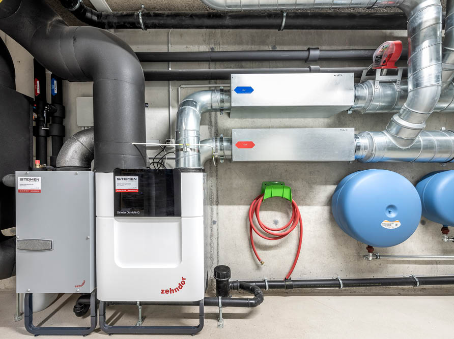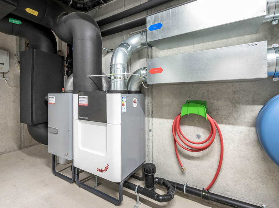 L’appareil de ventilation Zehnder ComfoAir Q se trouve dans la cave. Un tuyau ascendant acheminant l’air neuf et l’air vicié relie les habitations à l’appareil de ventilation. Avec la ventilation de base, l’échange d’air s’effectue avec récupération de la chaleur, comme dans un système de ventilation de confort, ce qui n’est pas possible avec une installation d’évacuation d’air simple.