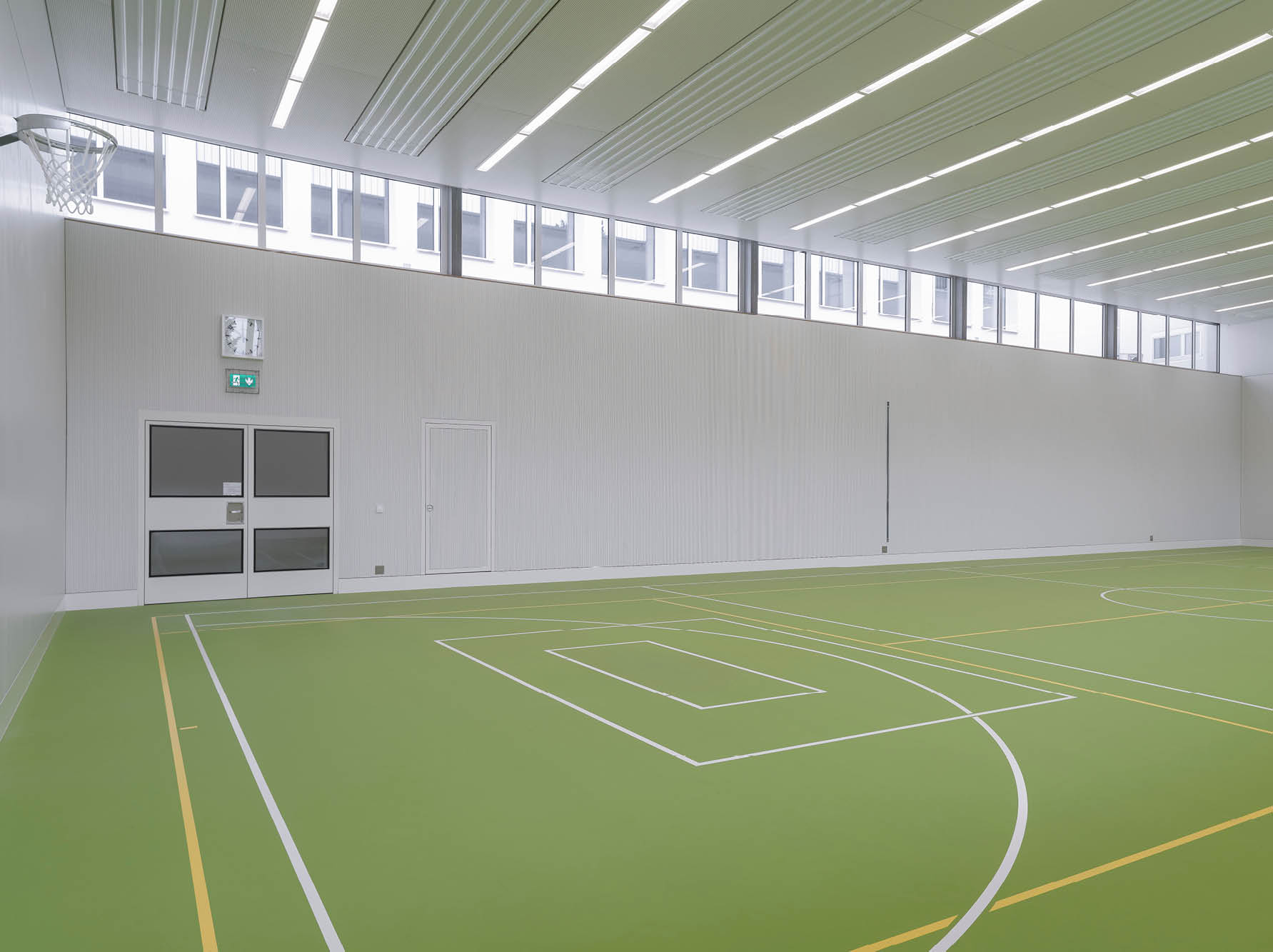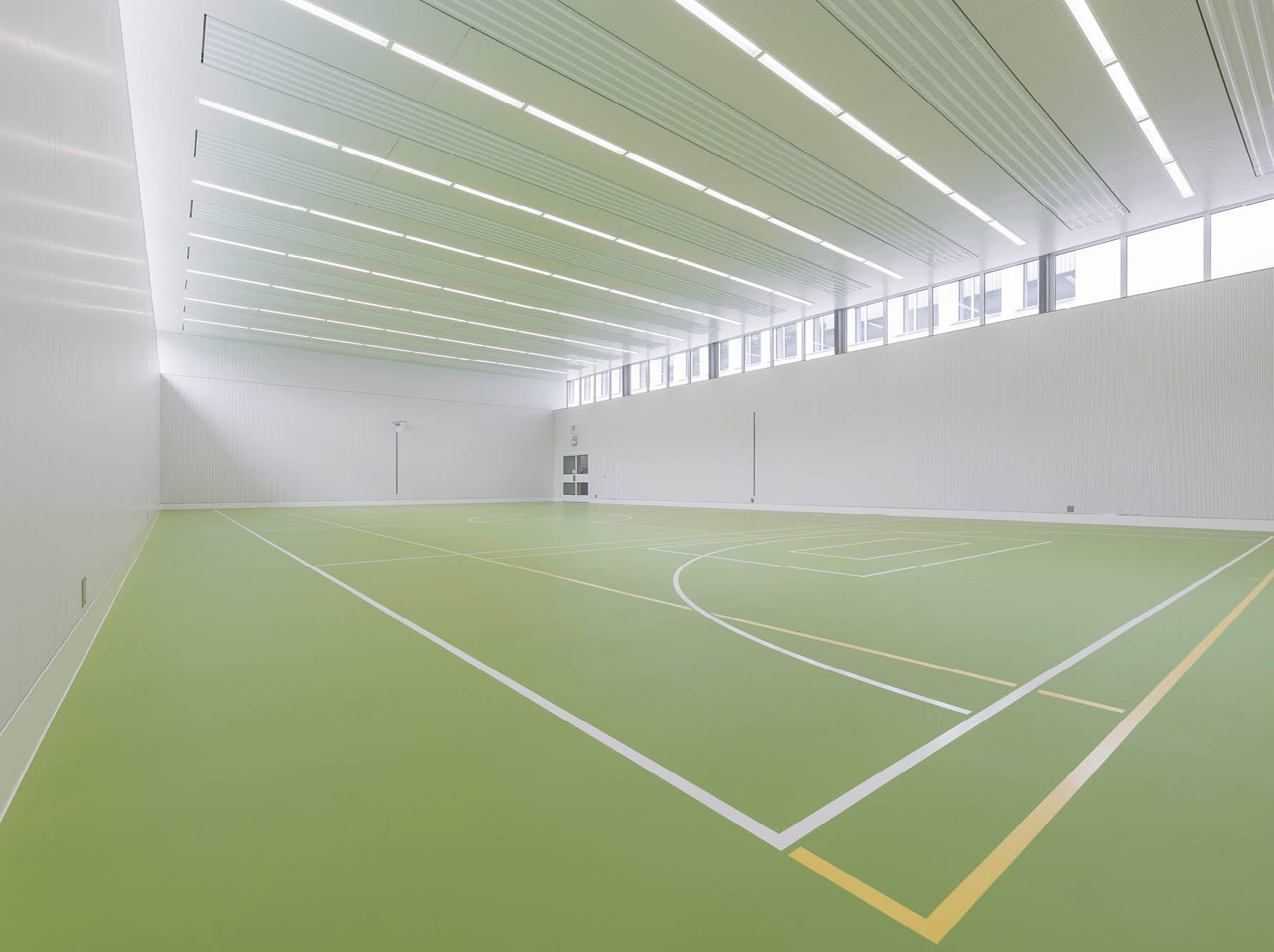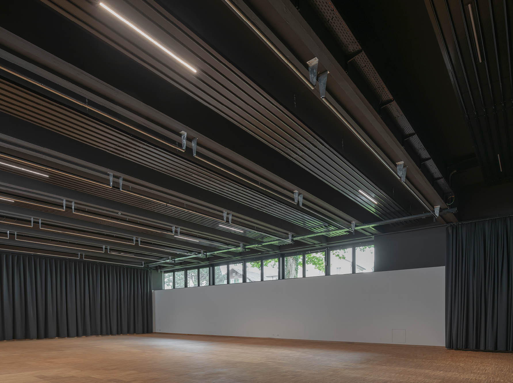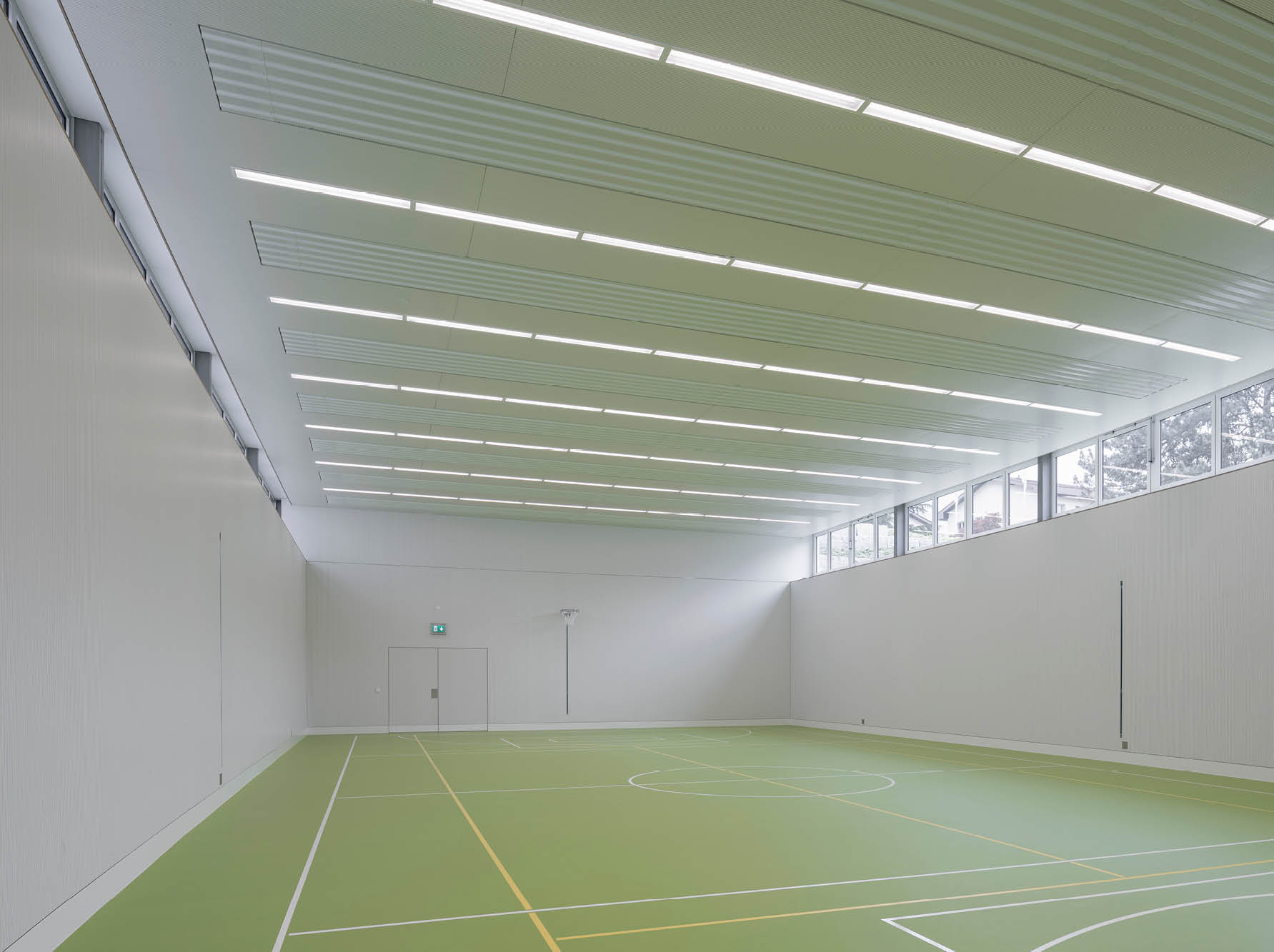 Pour le chauffage des deux salles de loisir, le maître d’ouvrage et l’architecte ont opté pour des panneaux rayonnants de plafond Zehnder. «Avec ce système de chauffage façade, la salle ne comporte aucun radiateur (facteur de risque de blessure). Nous avons également misé sur la flexibilité dans la répartition spatiale, avec par exemple des systèmes de rideaux ou le montage de parois intermédiaires», explique l’architecte Schönbächler.
