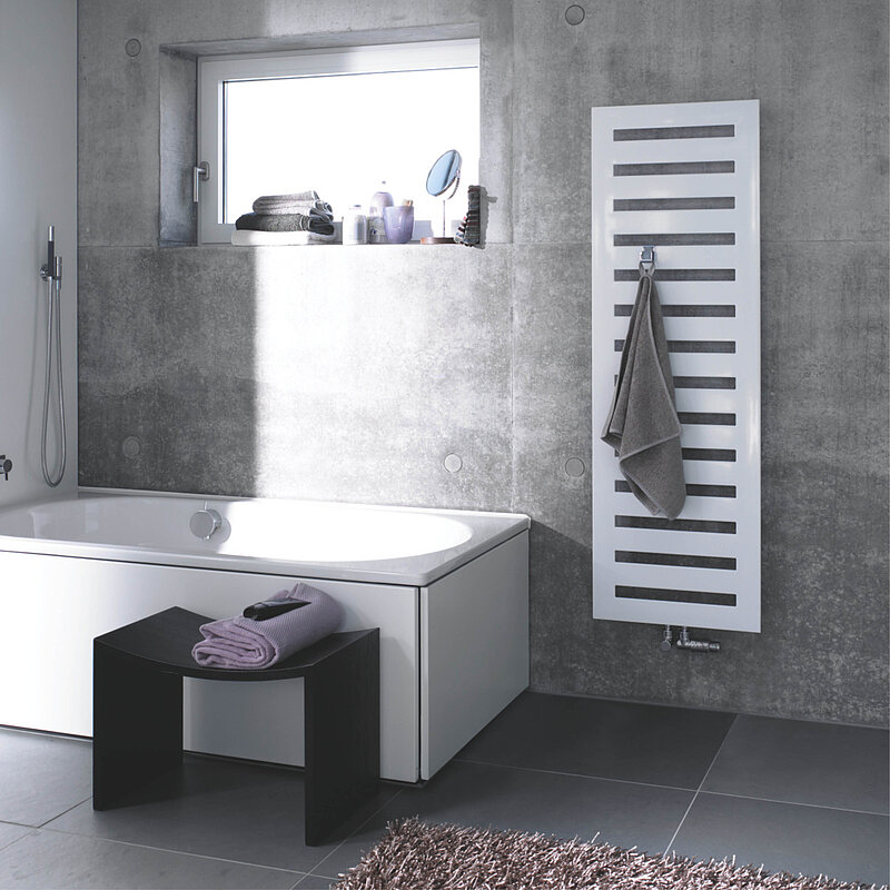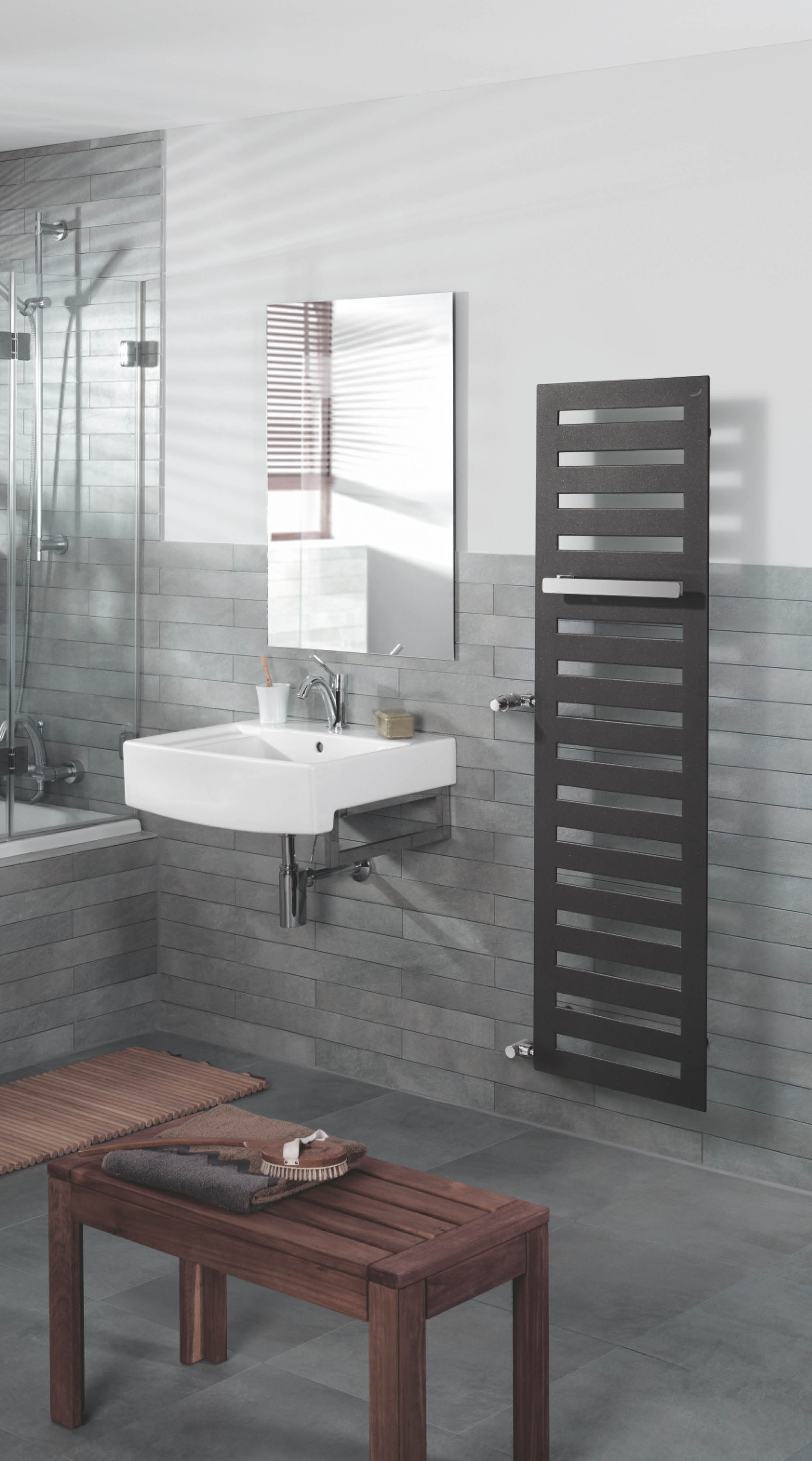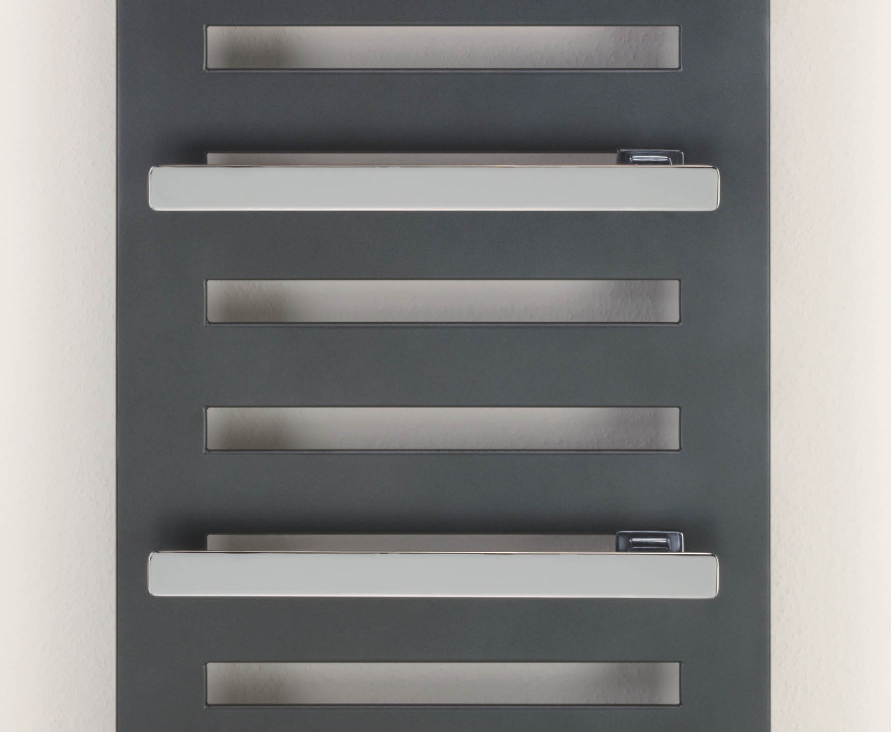 Per Zehnder Fina Lean Bar. Versione pregiata in acciaio, cromato o colorato, con fissaggio a 2 punti nascosto dietro il corpo riscaldante; capacità di carico max. 10 kg.