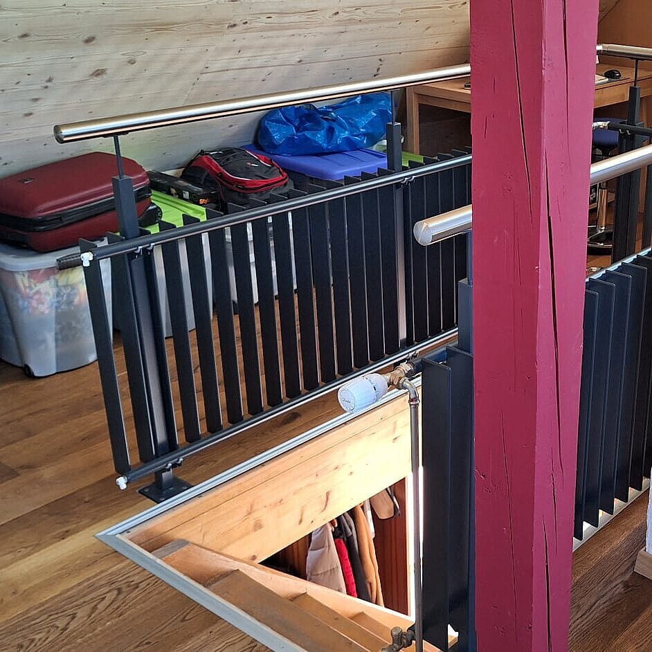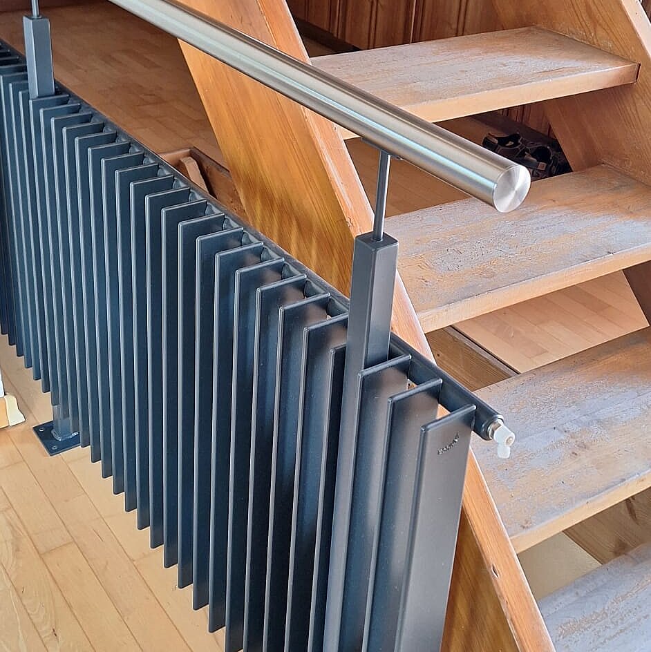 In questa casa di Fricktal, è stato utilizzato senza troppe esitazioni come elegante ringhiera per le scale. Il risultato? Non solo un effetto moderno, ma anche una pratica soluzione di riscaldamento per il solaio. Per salire in sicurezza e godere di un piacevole calore in un'unica soluzione: questa è quella che noi chiamiamo efficienza!