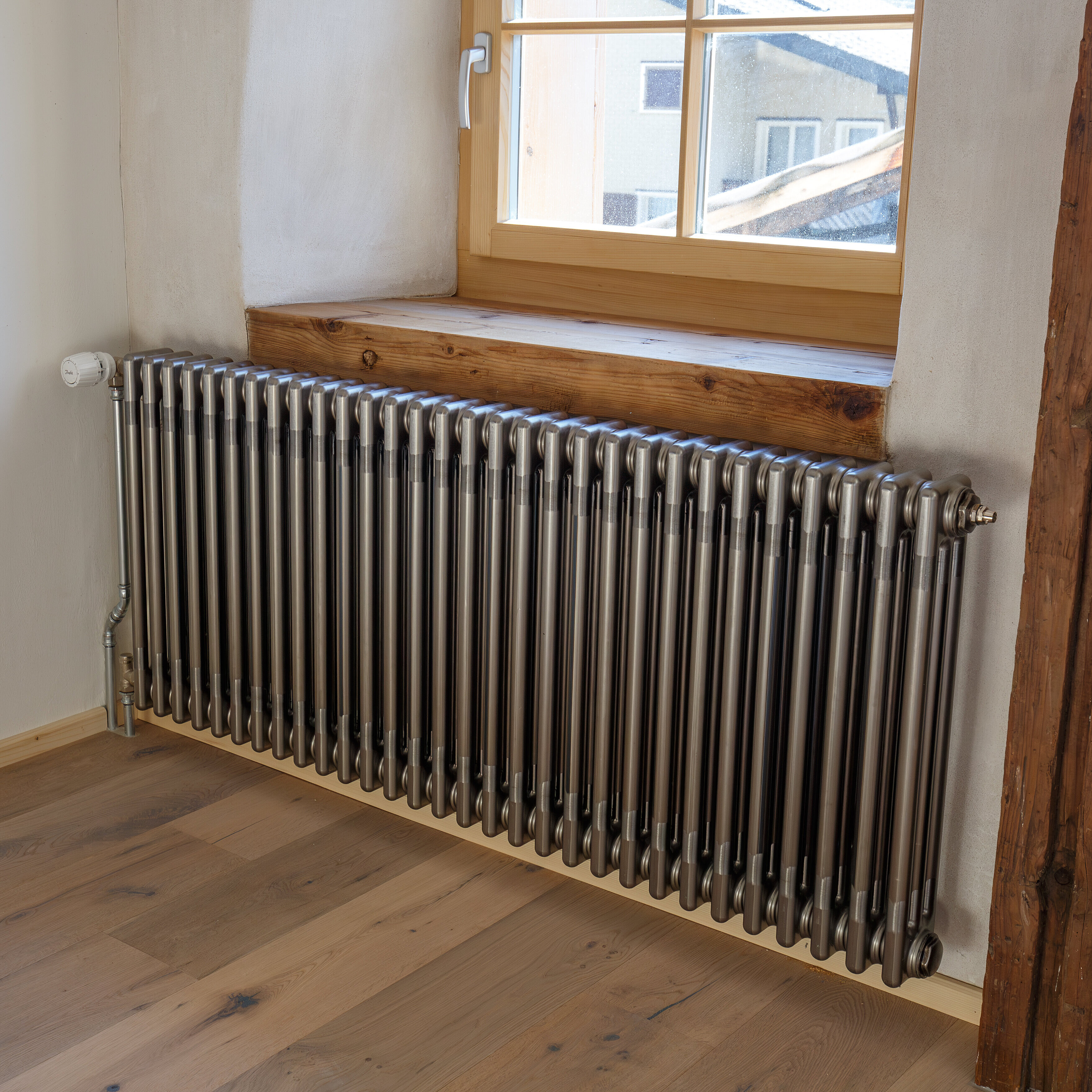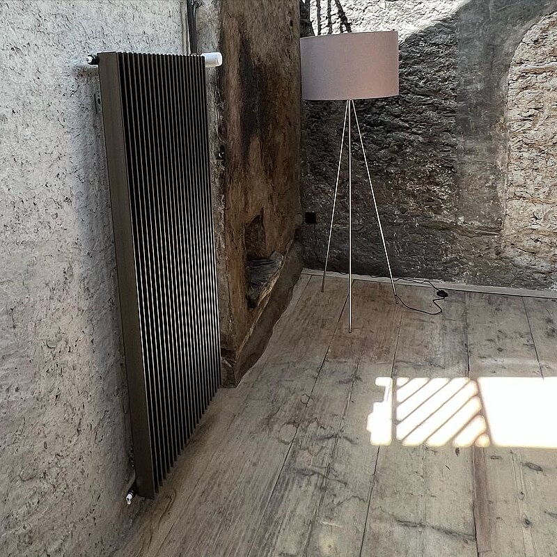 I corpi riscaldanti Zehnder Excelsior fanno bella mostra di sé con un effetto verniciato trasparente, che non solo è funzionale ma anche esteticamente accattivante. La bellezza di un edificio antico combinata con la moderna tecnologia di riscaldamento è semplicemente affascinante.