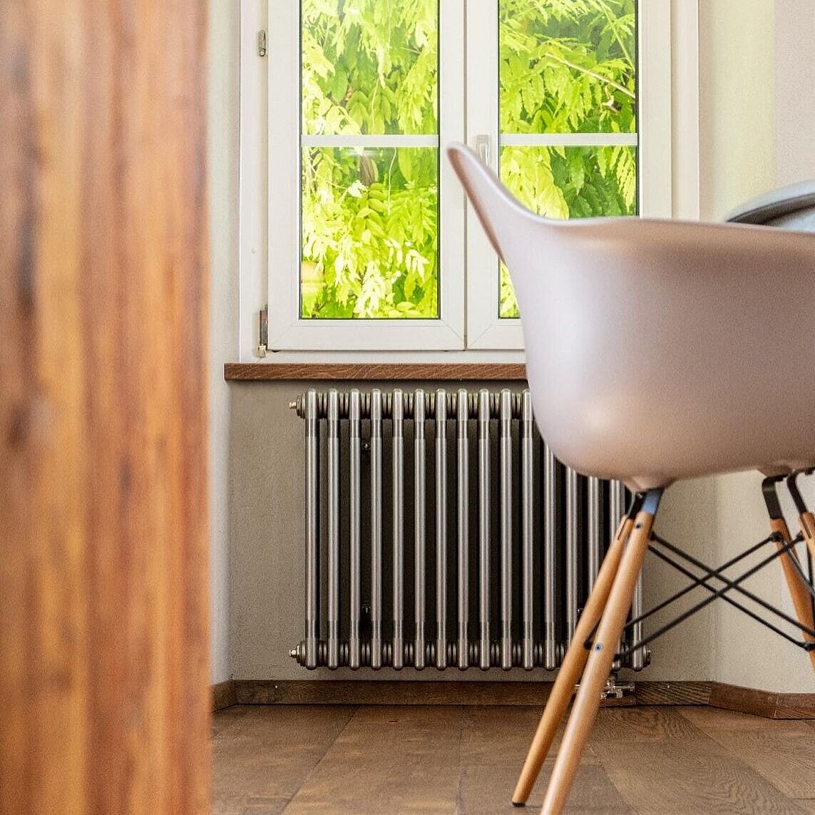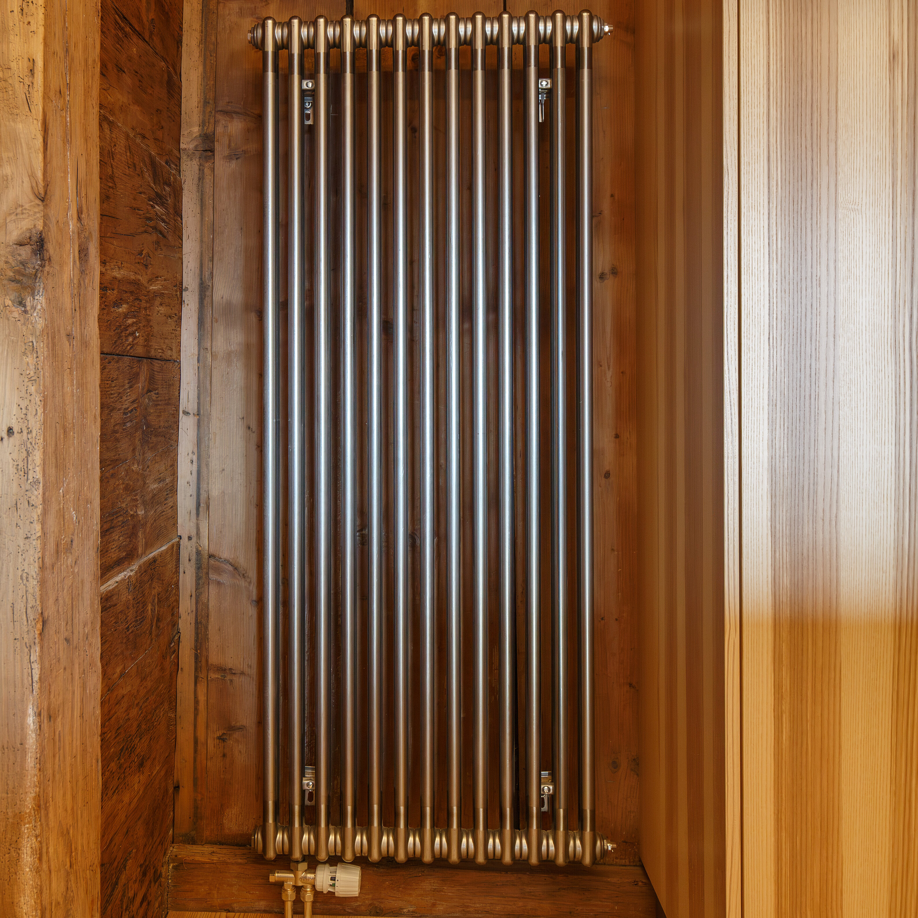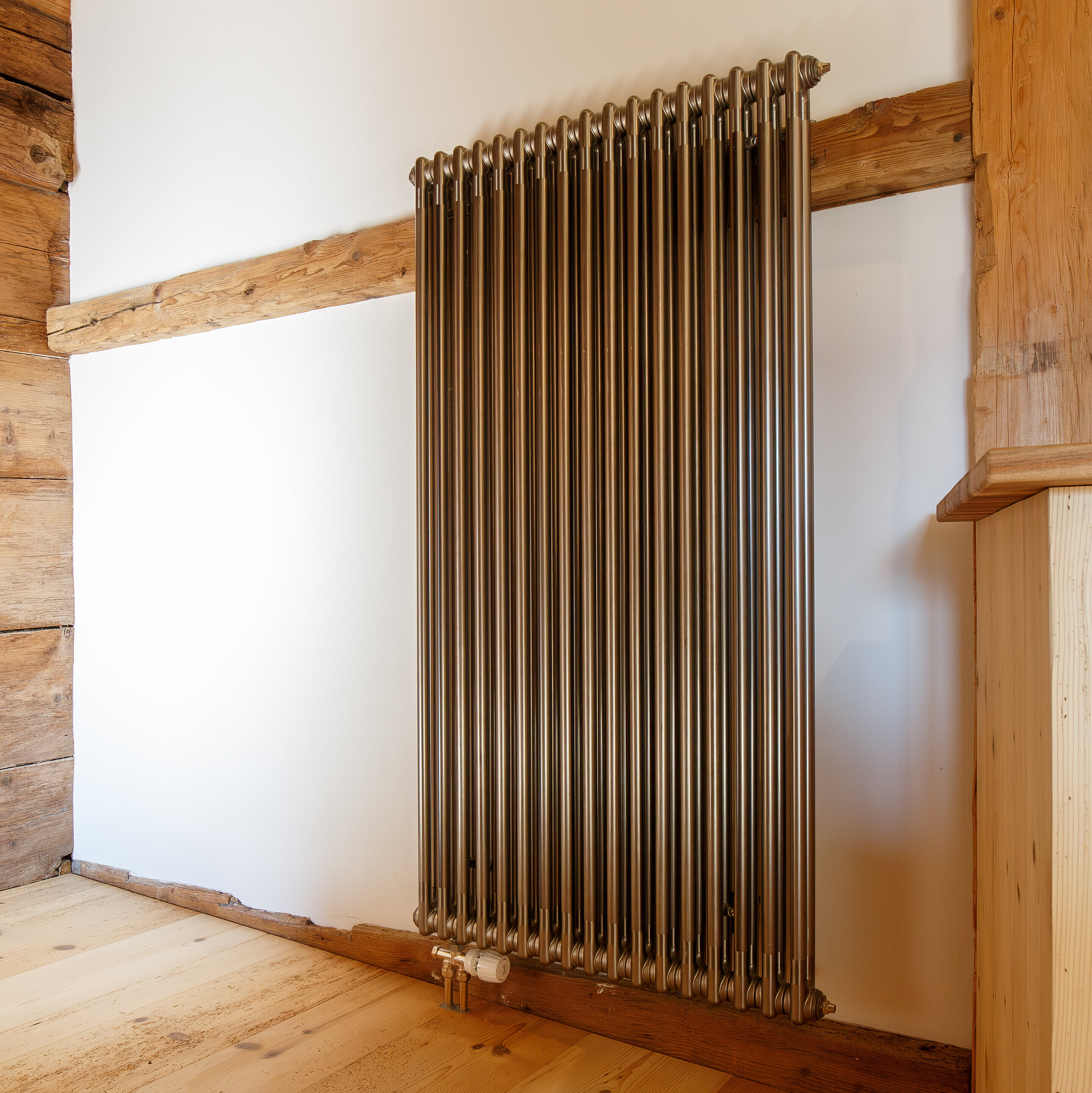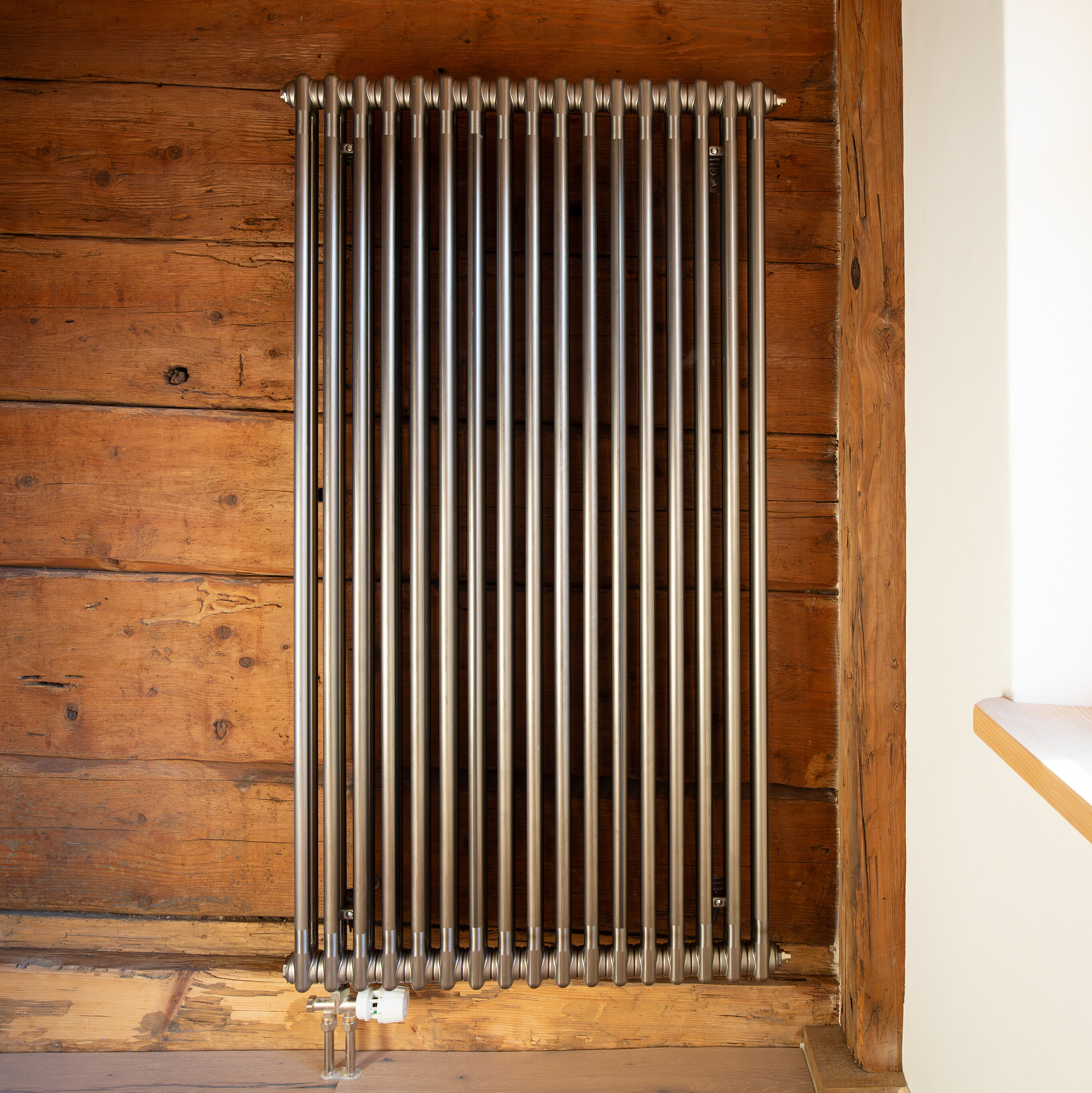 I corpi riscaldanti su misura in versione verniciata trasparente sono un vero e proprio richiamo visivo in ogni ambiente di questa accogliente casa colonica. Grazie alle loro dimensioni imponenti, i corpi riscaldanti Zehnder Charleston offrono un piacevole calore radiante su entrambi i lati e durante il funzionamento consentono di risparmiare energia grazie alla loro struttura ad ampia superficie.