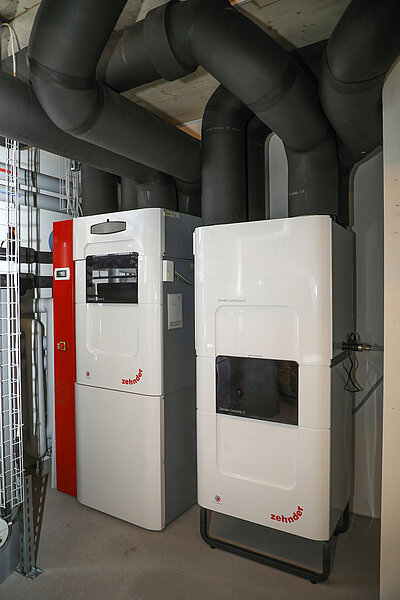 Alla fine il committente ha optato per gli impianti domestici dello specialista del clima ambientale Zehnder. Nel vano tecnico dell'edificio, nel seminterrato, è stata installata la nuova centrale energetica ComfoBox Q di Zehnder che combina in un apparecchio compatto una pompa di calore ad acqua glicolata/acqua e un sistema di ventilazione comfort con recupero del calore e funzione di raffreddamento. Grazie al pratico concetto «tutto in uno», la progettazione e l'installazione dell'apparecchio sono notevolmente semplificate. La pompa di calore ad acqua glicolata/acqua Zehnder ComfoHeat integrata utilizza il calore del terreno come fonte di energia e si adatta automaticamente al fabbisogno di calore dell'abitazione. Questa flessibilità determina un migliore coefficiente di lavoro annuale e riduce i cicli di accensione e spegnimento, rendendo superfluo l’utilizzo di un serbatoio tampone. La centrale energetica compatta Zehnder ComfoBox Q è dotata del collaudato apparecchio di ventilazione Zehnder ComfoAir Q. In questo modo si garantisce aria fresca e un clima ambientale piacevole nei locali commerciali. Per la ventilazione dell'appartamento al piano superiore è stato previsto un apparecchio di ventilazione a parte Zehnder ComfoAir Q 600 con accessorio per il raffreddamento. I tubi dell'aria di mandata e aspirata con un diametro di 110 mm sono stati installati in un controsoffitto. Per la climatizzazione, il tubo dell'aria di mandata è stato isolato. La portata volumetrica dell'aria per la ventilazione degli uffici ammonta in totale a 420 m3/h, quella per la ventilazione dell’appartamento a 380 m3/h.